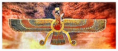 Het plaatje hiernaast toont de astrologische interpretatie van de 'faravahar'. Geen verwijzing naar vage algemeenheden, maar een concrete verwijzing naar de vier Vaste Tekens van de dierenriem: het teken Leeuw (het teken van de Zon, die staat voor vuur en licht),het teken Waterman (het teken van de anarchistische okaneet Uranus die voor vrijheid en broederschap staat), het teken Stier, het teken van de aardse planeet Venus, die voor lust, plezier en bezit staat (denkl aan het gouden kalf van Aaron), en het teken Schorpioen-Adelaar, het teken van de planeet Pluto die twee gedaanten kent: de hogere versie, de Adelaar, die voor geestelijke wedergeboorte staat, en de lagere versie, de Slang, die voor verleiding en misleiding staat (denk aan het paradijsverhaal, waar Adam en Eva hun onschuld verliezen omdat ze zich overgeleverd hebben aan de valse beloften van een in slangengedaante misleider).