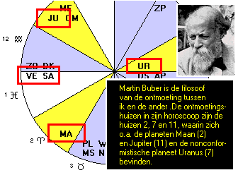 Martin Buber is geboren op 8 februari 1878 in Wenen, rond 7u 15m 's morgens. Ascendant bevindt zich in het teken Vis. Venus, planeet van de liefde en de harmonie, en Saturnus, planeet van de ernst, het geweten en het zelfonderzoek, bevinden zich in het eerste huis. De vriendenhuizen geven, door de plaatsing van de planeten Jupiter en Maan in de huizen 2 en 11, een 'koninklijke aanvulling'.