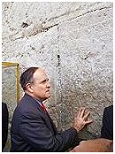 New York Mayor Rudolph Giuliani touches the Western Wall, Judaism's holiest site, in east Jerusalem's Old City, Sunday, Dec. 9, 2001. The delegation headed by the Governor of New York George Pataki, Giuliani and New York Mayor-elect Michael Bloomberg, is in Israel for a one-day solidarity visit to express support for the Israeli people in the wake of the recent attacks that left dozens dead and hundreds wounded. (AP Photo/Lefteris Pitarakis)