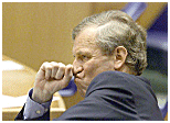 "President George W. Bush’s “axis of evil” speech played directly into Sharon’s hand, simultaneously legitimizing “unilateralism” and the undermining of international law, while claiming exclusivity of values and the right to use unbridled (and accountable) force to achieve immediate ends.