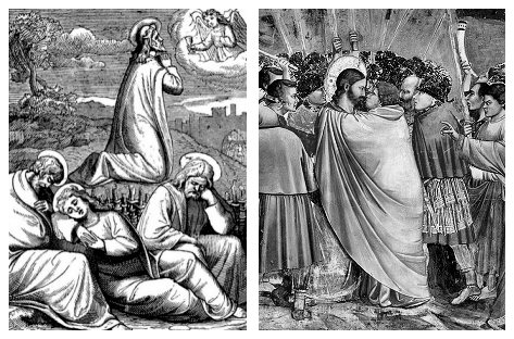 Als Judas komt met de krijgslieden verraadt hij Jezus door hem een kus te geven, het afgesproken teken, waaraan men Jezus herkennen zou. Jezus zegt dan: "Judas, verraadt Gij den Zoon des Mensen met een kus?"