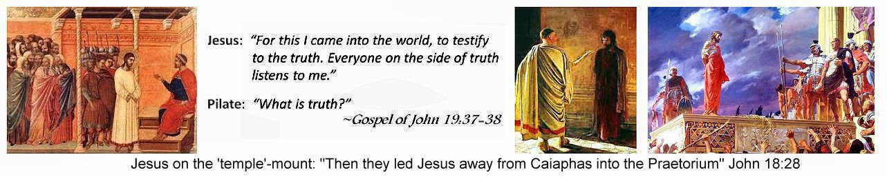 Josephus then said that Fort Antonia itself was built around a notable "Rock" that was viewed as the centerpiece feature of the interior of the Fort (which was also known as the Praetorium). This well-recognized "Rock" in the Praetorium around which Fort Antonia was built was called the lithostrotos in the Gospel of John (19:13) and Christ stood on it when judged by Pilate. Josephus said that Antonias size was much larger than the Temple (he described Fort Antonia as the size of a city and it contained a full legion of Roman troops with many open spaces for military exercises and training). Fort Antonia was so large that Josephus said it obscured the whole of the Temple square from the north. These plain and simple descriptions made by Josephus are depicted in the drawing that Ritmeyer dislikes and they are in precise accord with what Josephus (as an eyewitness) states in the clearest of language. (Klik voor bron)